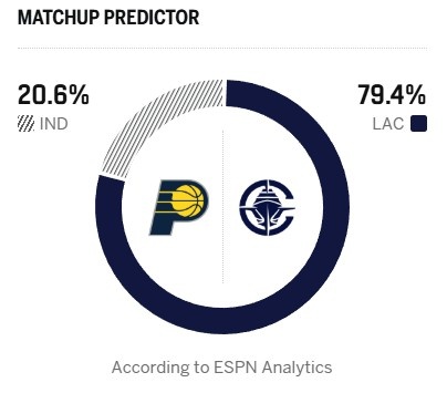即将追上勇士?ESPN明日胜率预测:快船高达79.4% 步行者20.6%